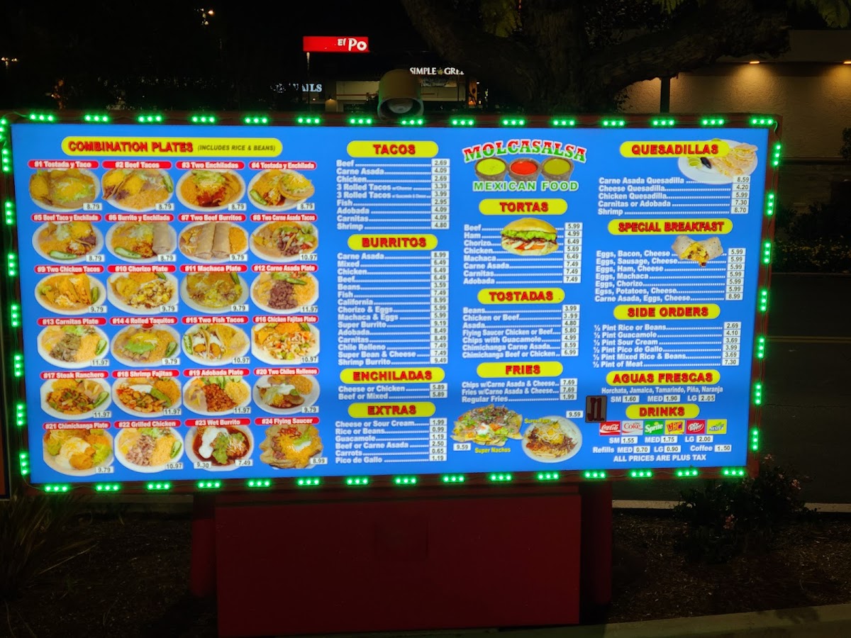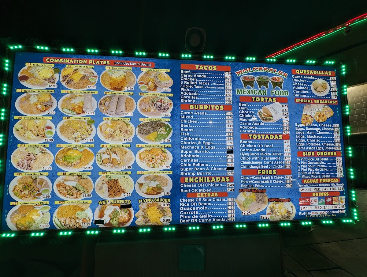 The menu at Molcasalsa Mexican Food offers a variety of Mexican and fast food options available throughout the day and night, reflecting its 24-hour service. It is structured into several key categories to accommodate different tastes and meal preferences.