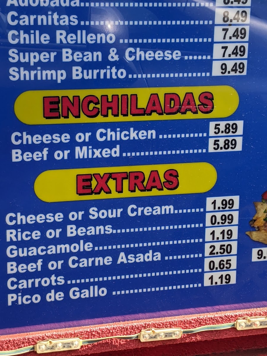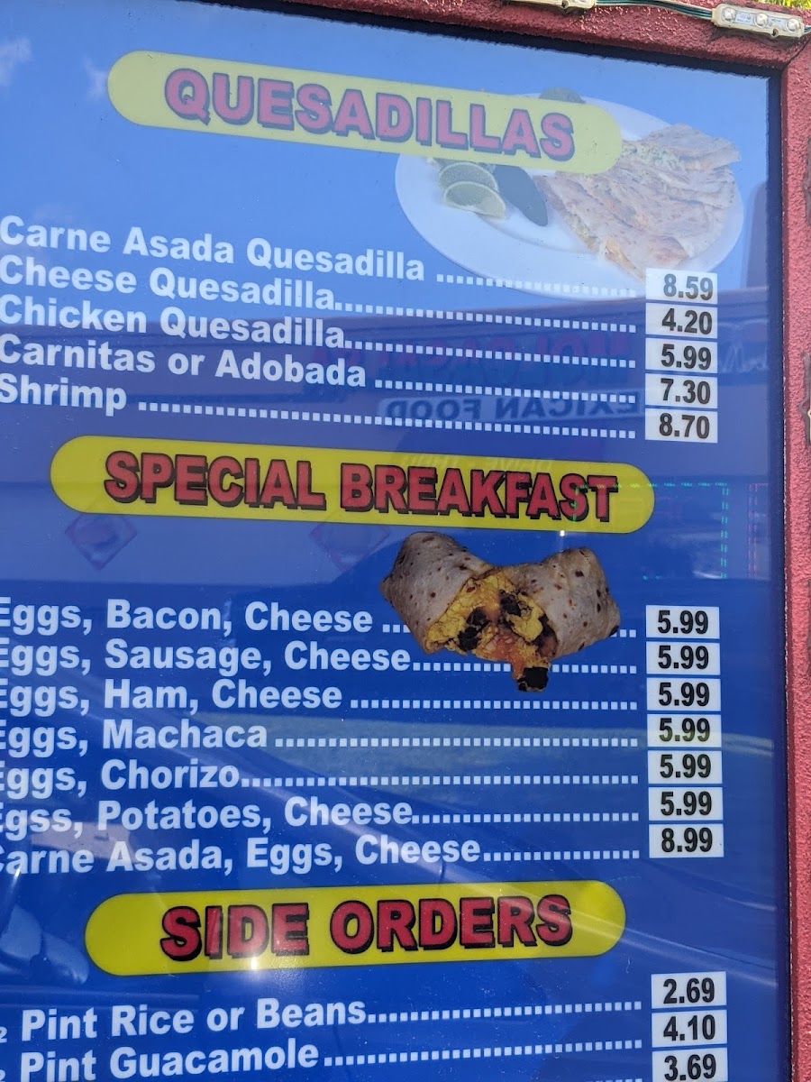 Beverages: The menu features a selection of aguas frescas, including Horchata, Jamaica, Tamarindo, Piña, and Naranja. These traditional Mexican drinks are available all day and provide a range of refreshing, non-alcoholic options.
